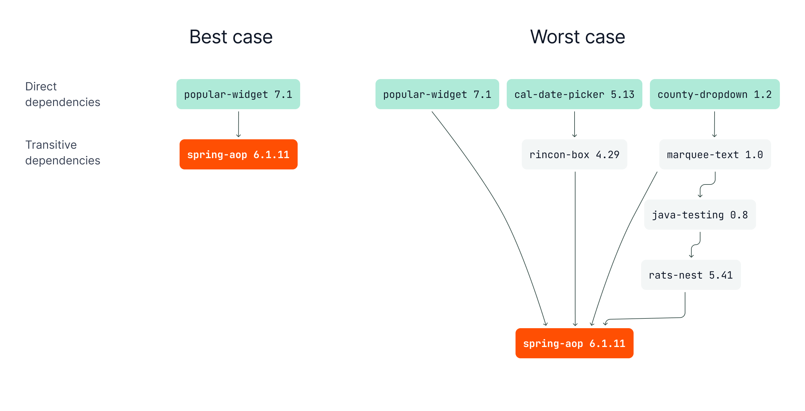 Imagine your SCA tool has flagged multiple critical vulnerabilities in the transitive dependency of spring-aop 6.1.11. The AppSec team knows they should remediate this, but they do not know how many layers deep it falls, nor which direct dependencies require an upgrade to remediate the vulnerabilities. In the best case, the vulnerable package is not too deep in the dependency tree. In the worst case, it lives several layers deep and can be used by several other dependencies! A transitive vulnerability this deep requires a very high level of commitment to unravel, not to mention its relatively lower priority when compared to more straightforward vulnerabilities.