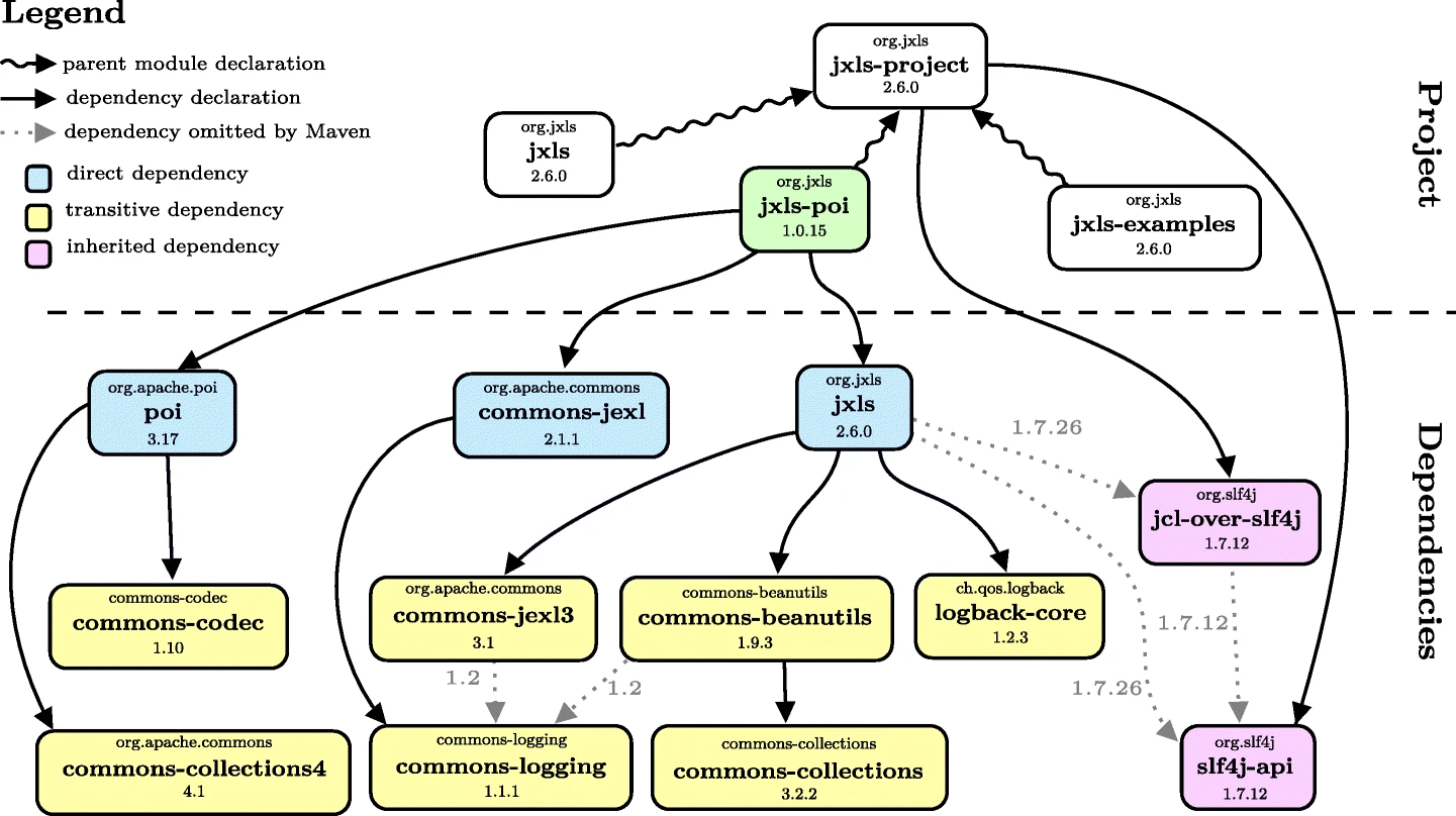 Transitive dependencies: the direct dependencies’ dependencies; relationships inherited through direct dependencies, potentially several layers deep