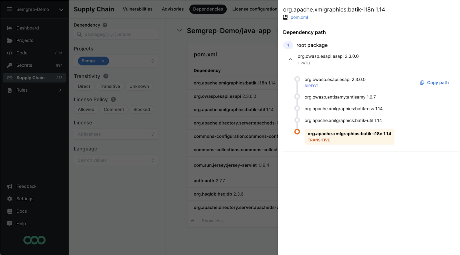 Semgrep now solves this challenge with the Dependency Path feature. To understand how a dependency has been introduced into your project, simply look at a transitive dependency’s path. Easily see which direct dependencies you need to upgrade or replace in order to remediate the vulnerability and secure your code. A direct impact of our visualization is the immediate knowledge of if a transitive vulnerability is only one or many layers deep– which changes both the risk profile and remediation effort– and thus the prioritization.