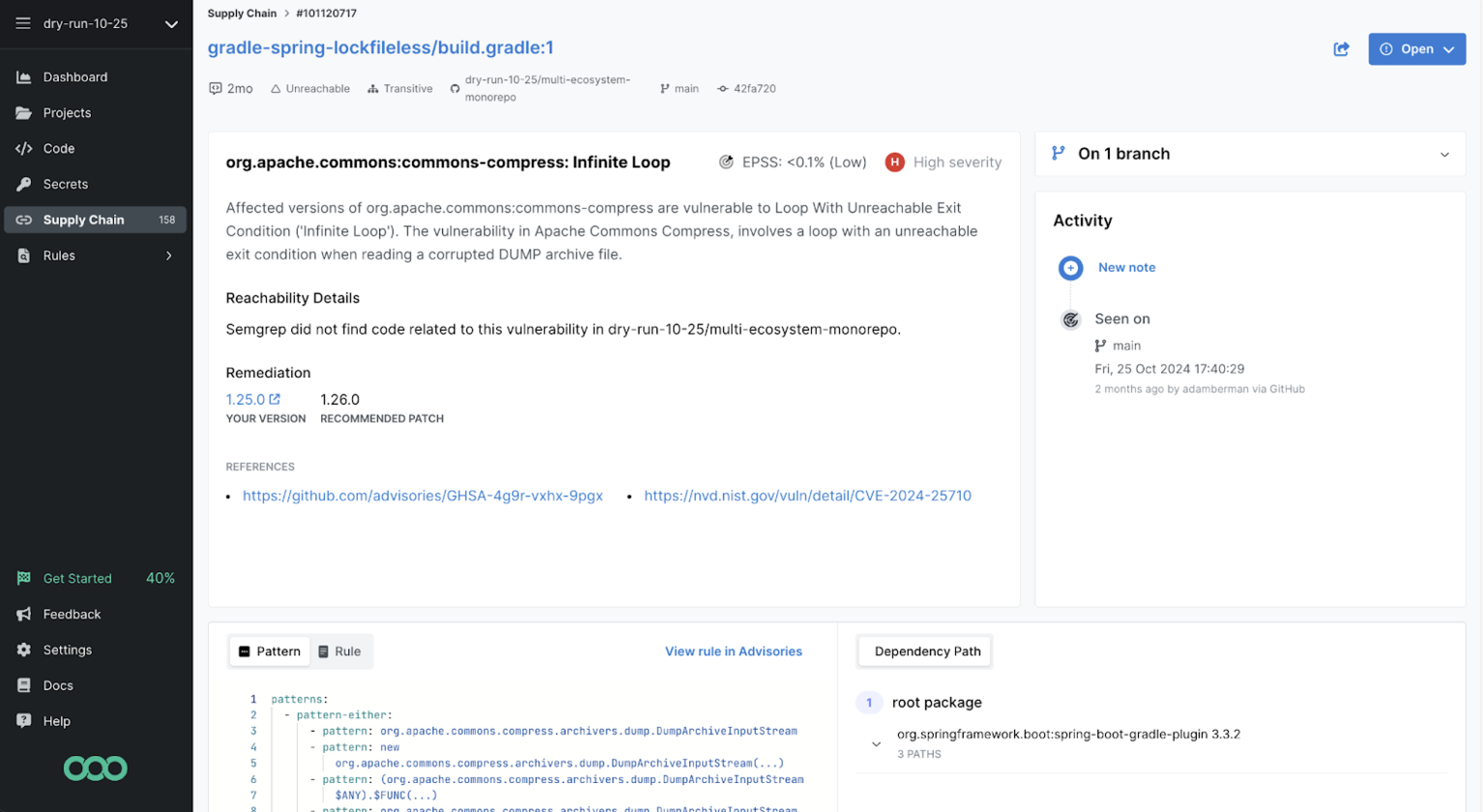 Enter Semgrep’s Dependency Path. By visualizing the path of a critical vulnerability through the graph—traced back three layers to a rarely updated library—developers now know exactly which direct dependencies are responsible for introduction of the vulnerable, transitive ones. This map helps prioritize which vulnerabilities to remediate by surfacing how many paths and layers exist.