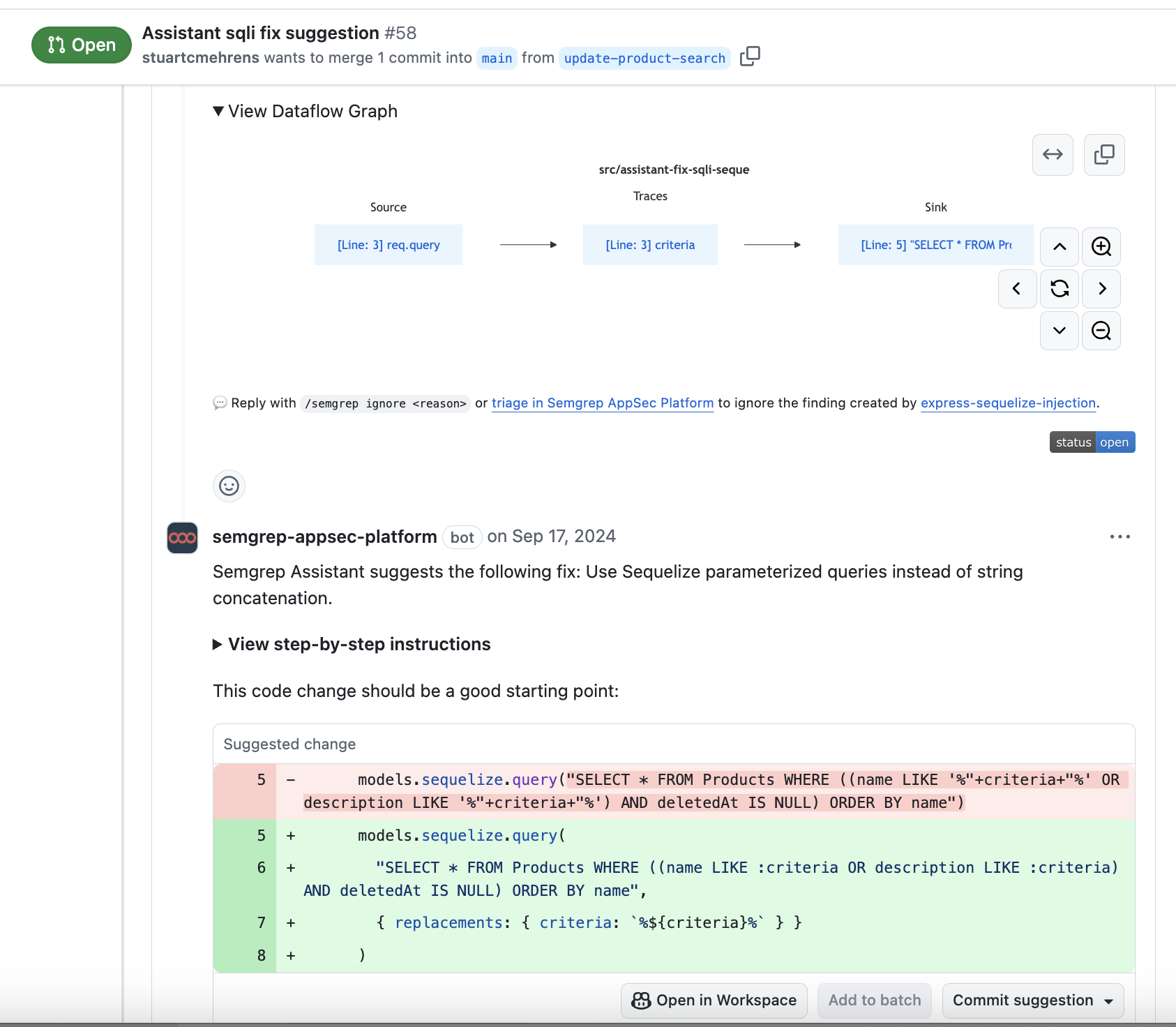 Move fast and stay secure with built-in AI that scales as you grow. Semgrep’s AI Assistant accelerates secure delivery by triaging findings, recommending fixes, and guiding developers through step-by-step remediation.