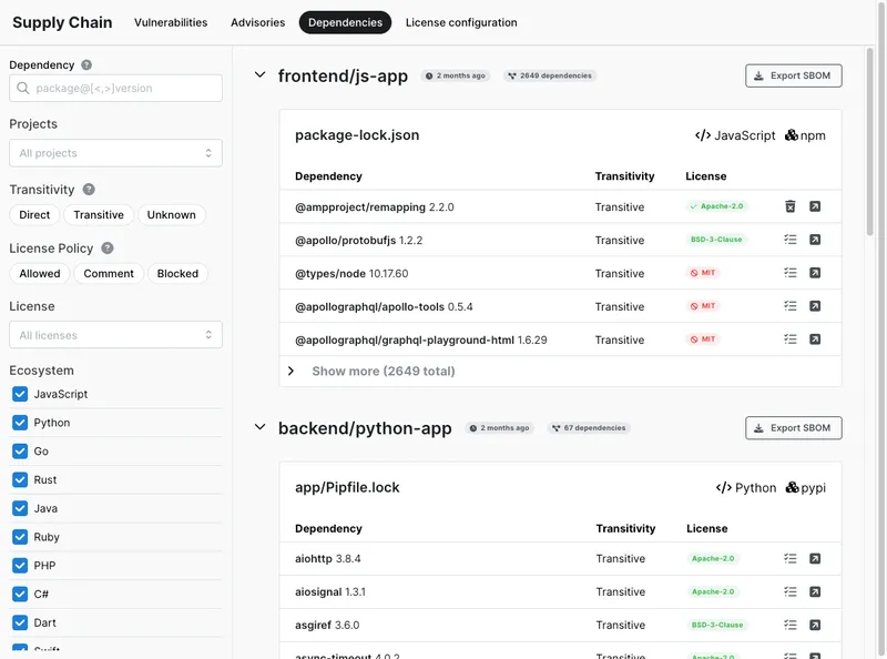Software bills of materials (SBOM) are key to supply chain risk management. Export inventories via CycloneDX format, including direct and transitive dependencies.